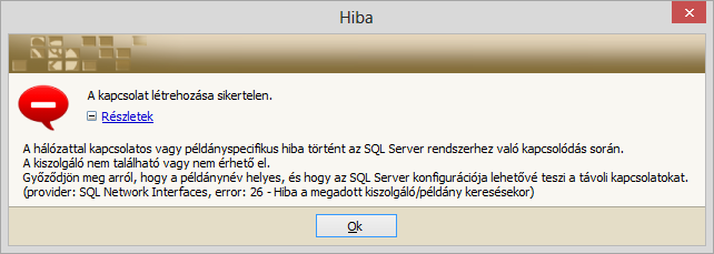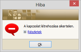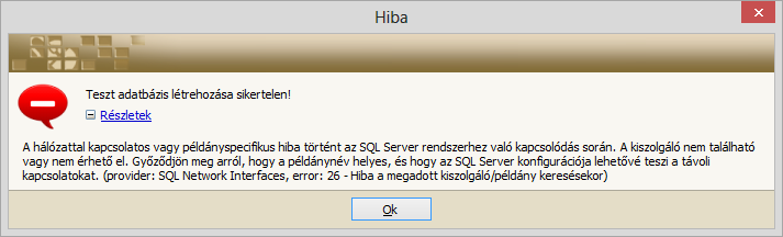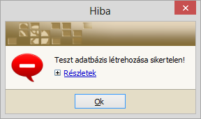 üzenet jelenik meg, és nyugtázása után a programfutás végetér (hiszen adatbázis nélkül nem használható). A Részletek linkre kattintva a rendszer által - a hiba okáról - küldött üzenet olvasható. mint pl.: