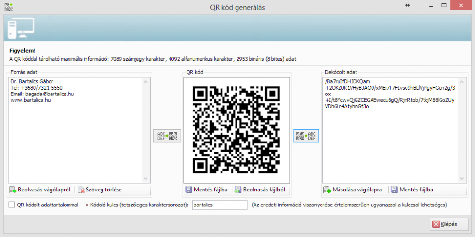 - a QR kódolt adattartalommal kijeelölése mellett megadott Kódoló kulcs-csal történik a QR kód előállítás, majd a dekódolás, akkor a dekódolt információ - értelemszerúen - megegyzeik az eredeti információval,
