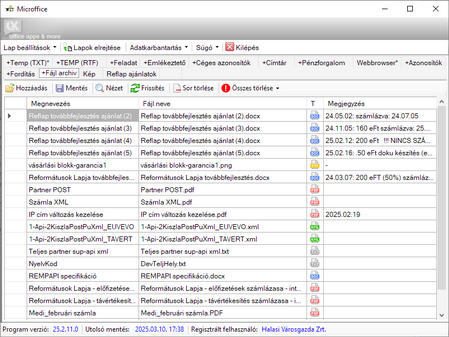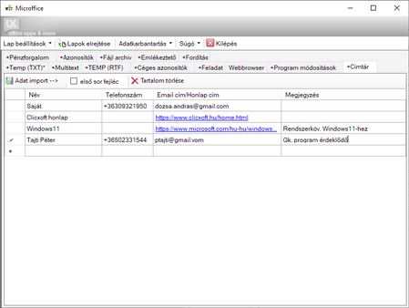 címtár, ahol táblázatos formában aktuális szükséges telefonszám, email-, honlap cím stb. tartható nyilván,