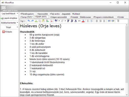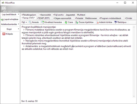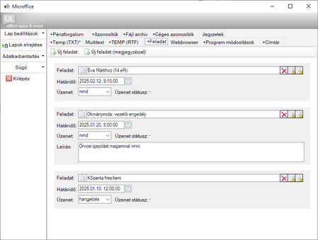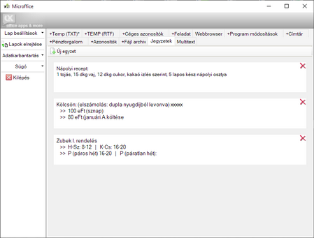 korlátlan számú, rövid (néhány mondatos) emlékeztetők (pl. háziorvos rendelési ideje, online rendelés rendelési száma stb.) nyilvántartására szolgáló munkalap, és