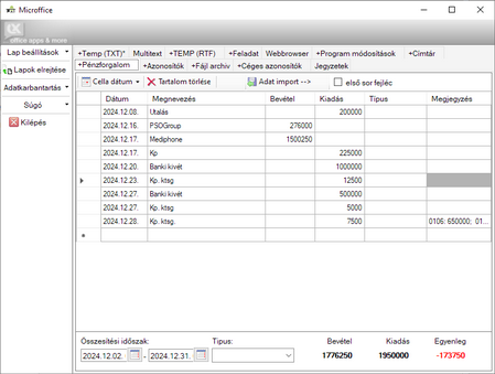 pénzforgalom nyilvántartó a napi bevételek/kiadások követéséhez,