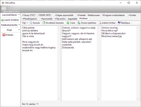 sima szöveges típusú adat (olyan munlalap is létrehozható, ahol max. 4 szöveges terület van egymás mellett --> ez olyankor hasznos, ha különböző szövegeket vizuálisan akarunk összevetni),